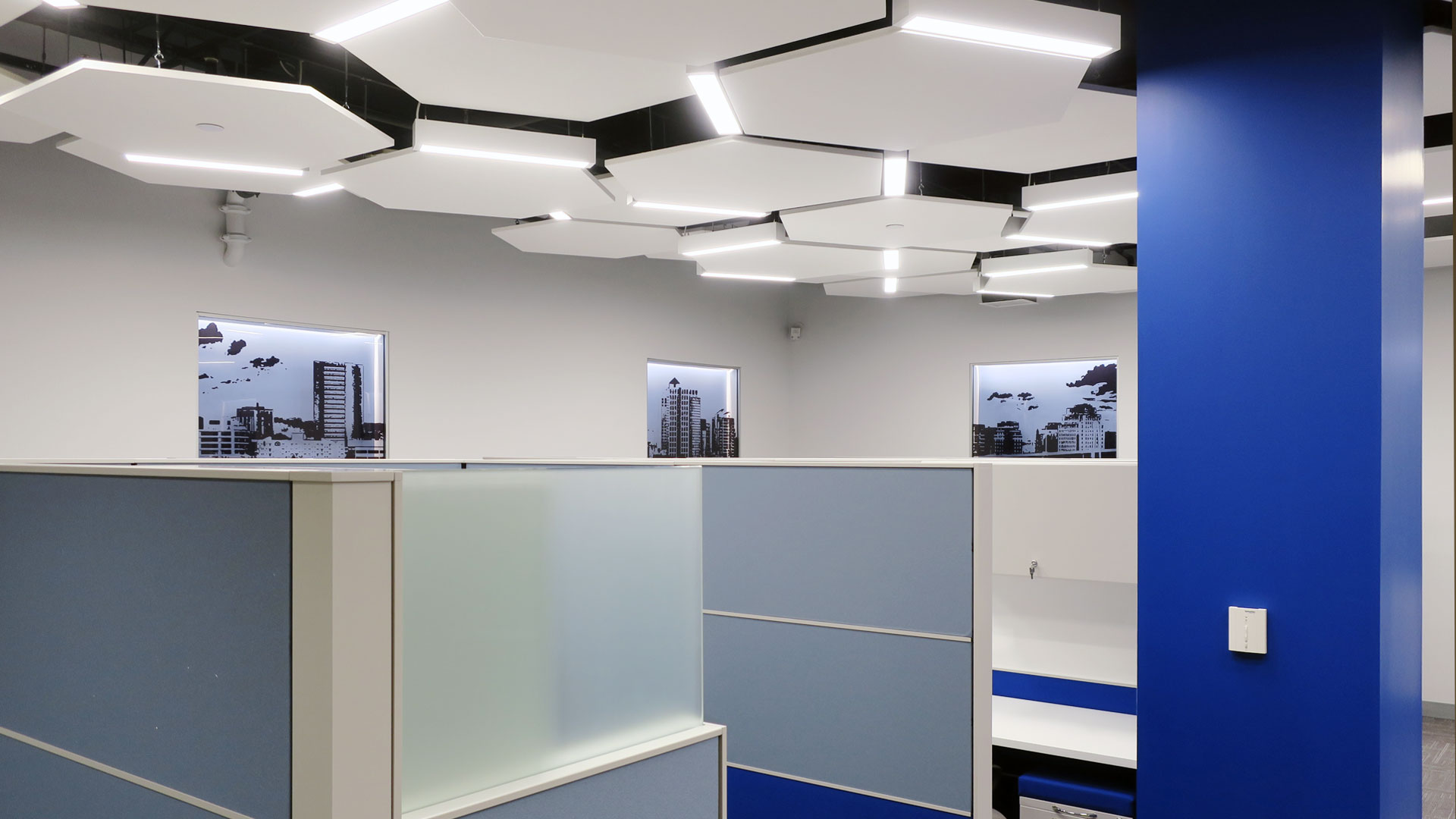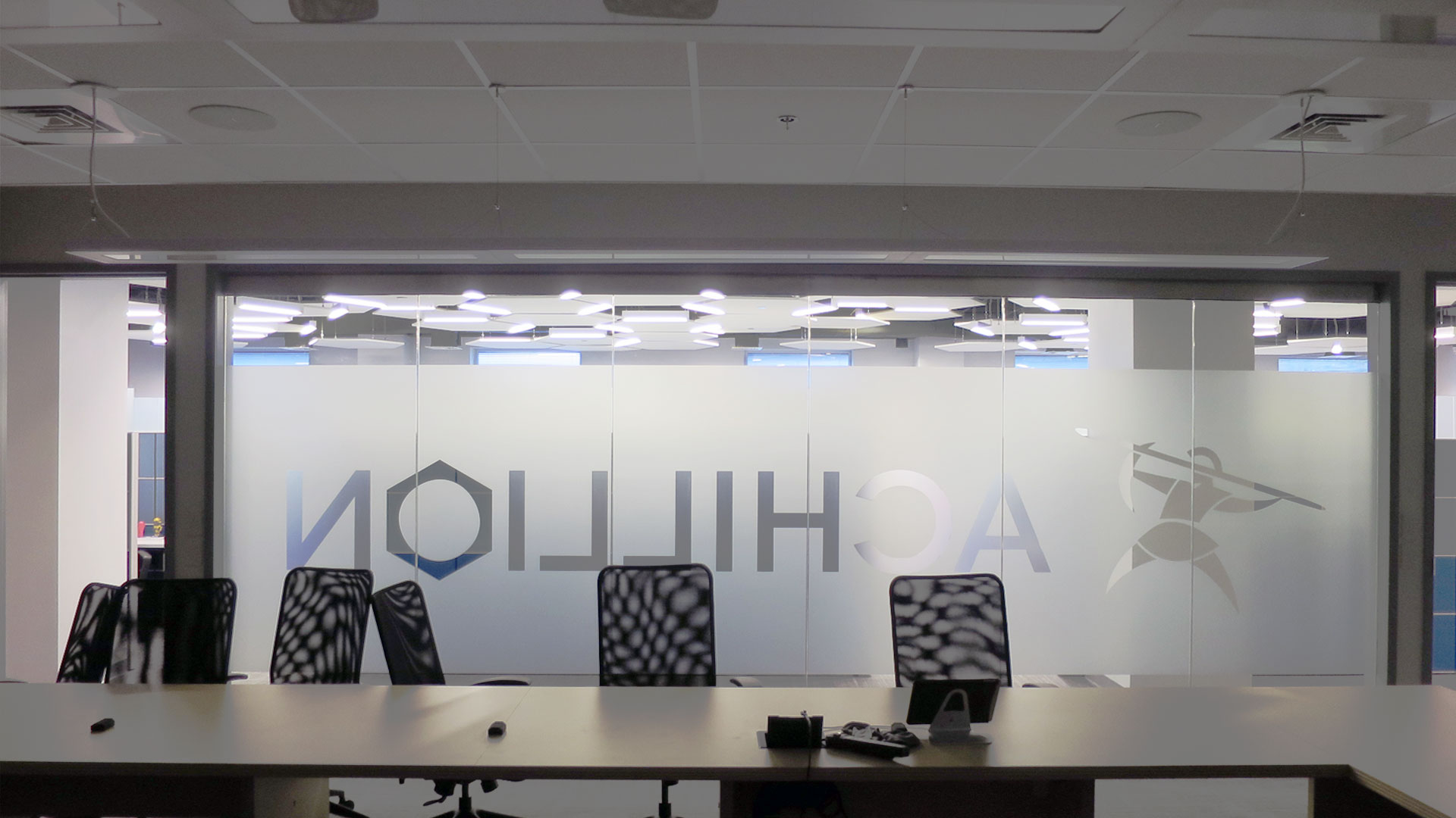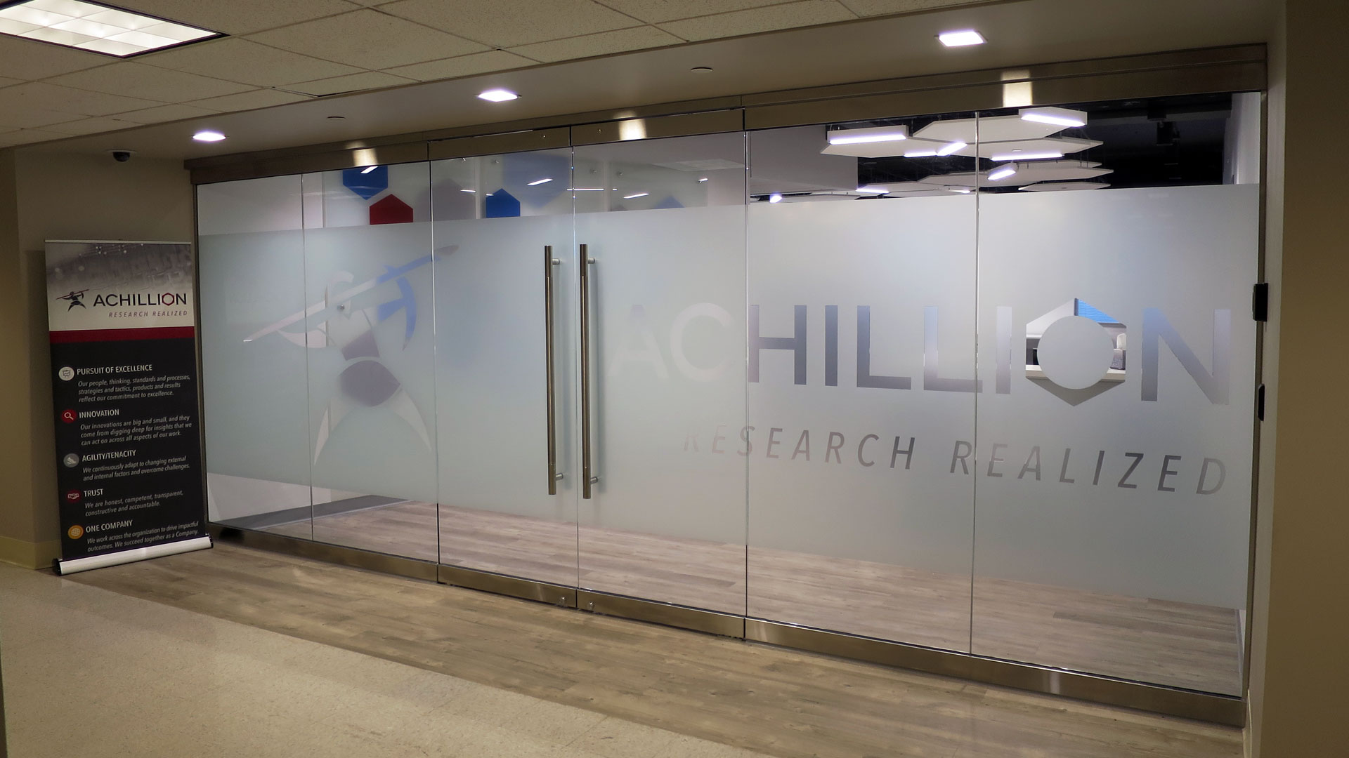When Achillion Pharmaceutical needed to renovate their corporate headquarters, a thorough branding exercise was performed, with architecture referencing their logo down to minute details. The hexagonal logo was interpreted through architectural space, and can be seen in ceilings, wall art, lighting, and floor plan layout.