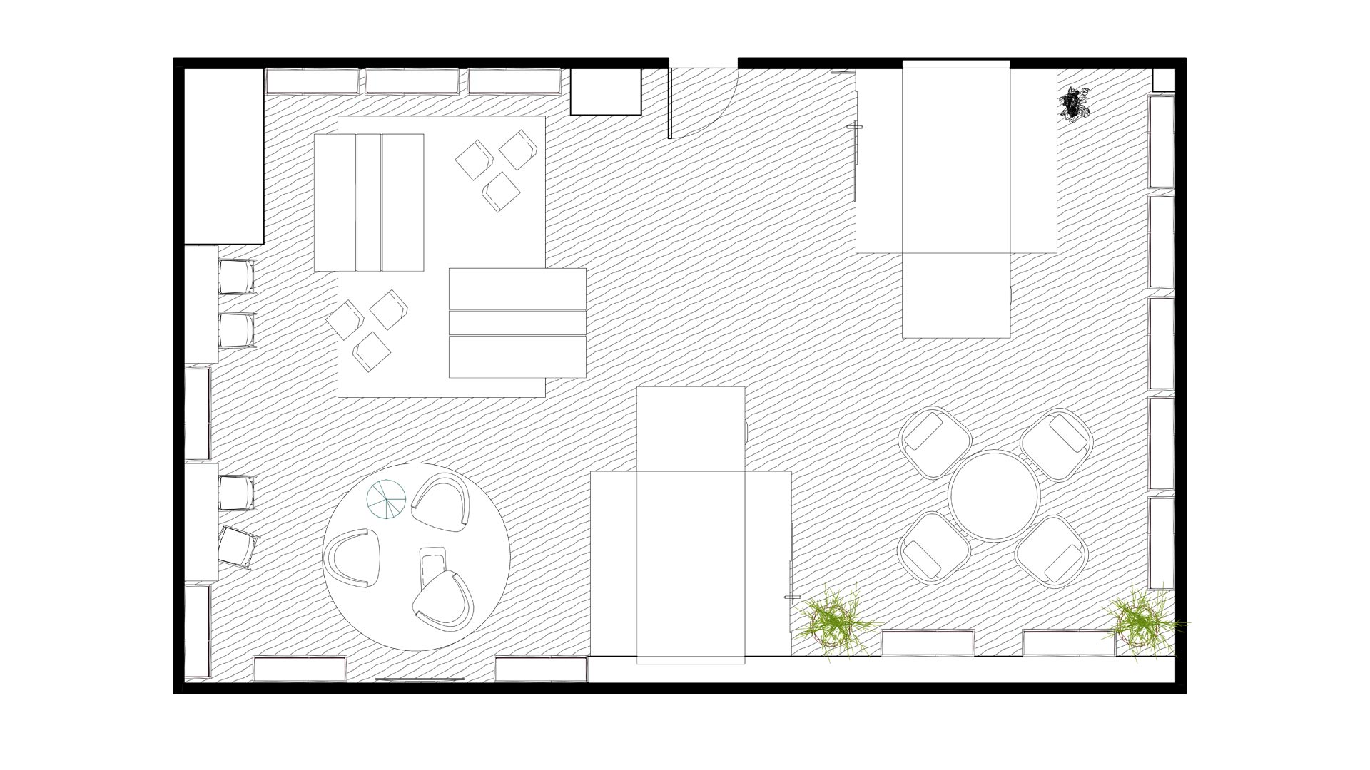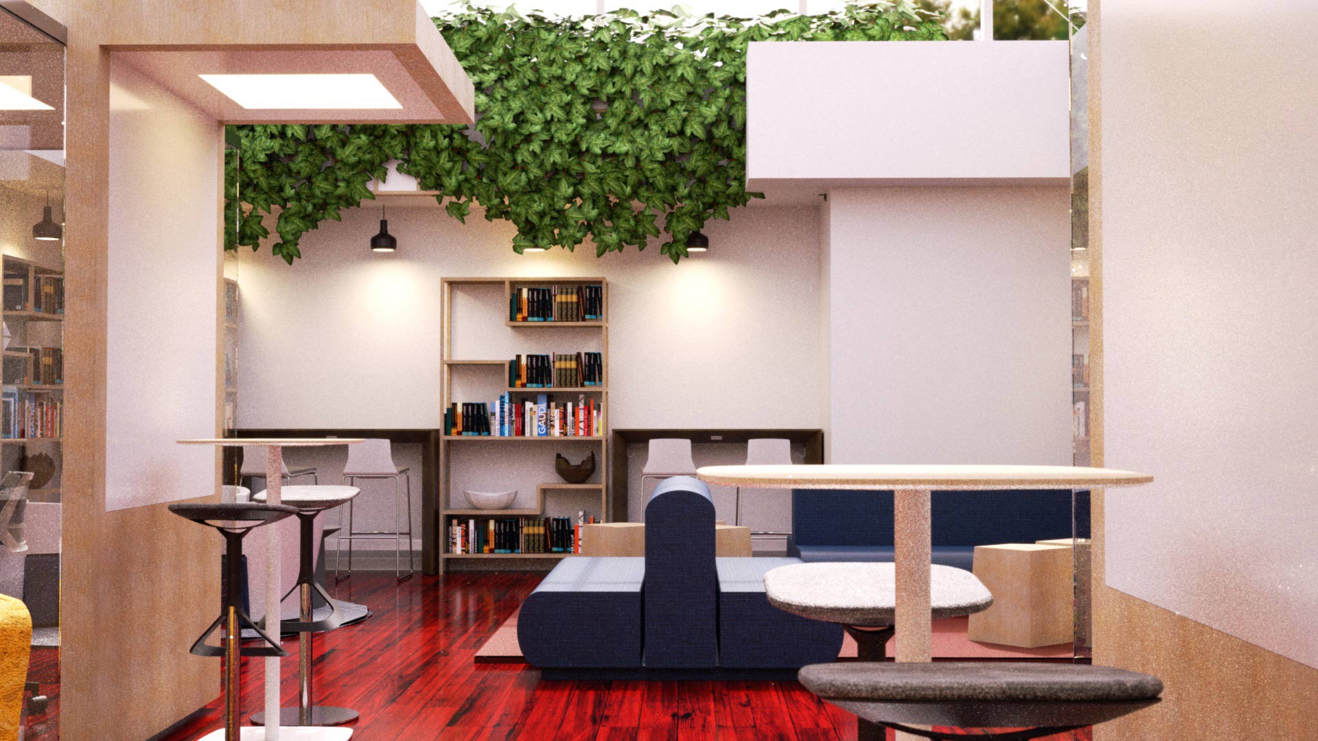 An Aerospace company that wanted to convert a space in their current building into a library that was both functional and inviting. This new space allows for personal and collaborative library use, different, functional furniture, along with plenty of sunlight and greenery.