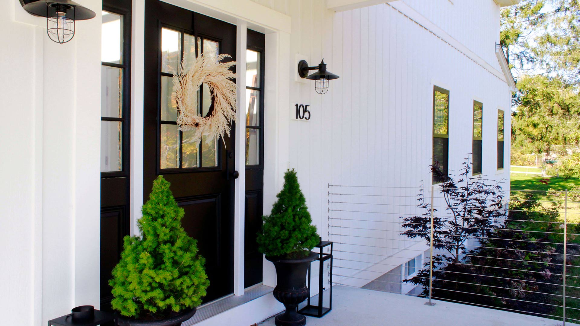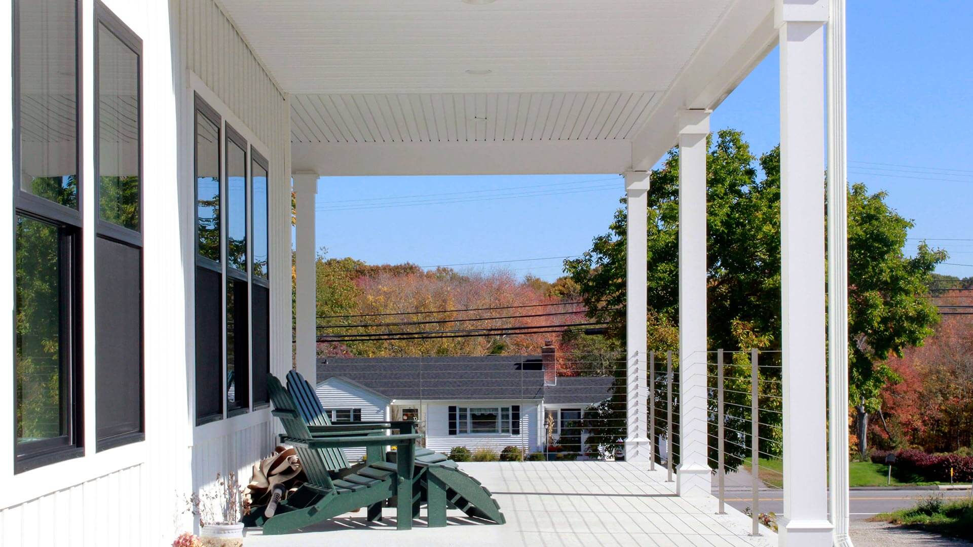 This modern farmhouse packs a lot of punch, with a classic exterior with client driven elements to get their vision realized. A standing seam metal roof over the wrap around porch is complemented by a cable railing for a modern look balanced by traditional farmhouse elements.