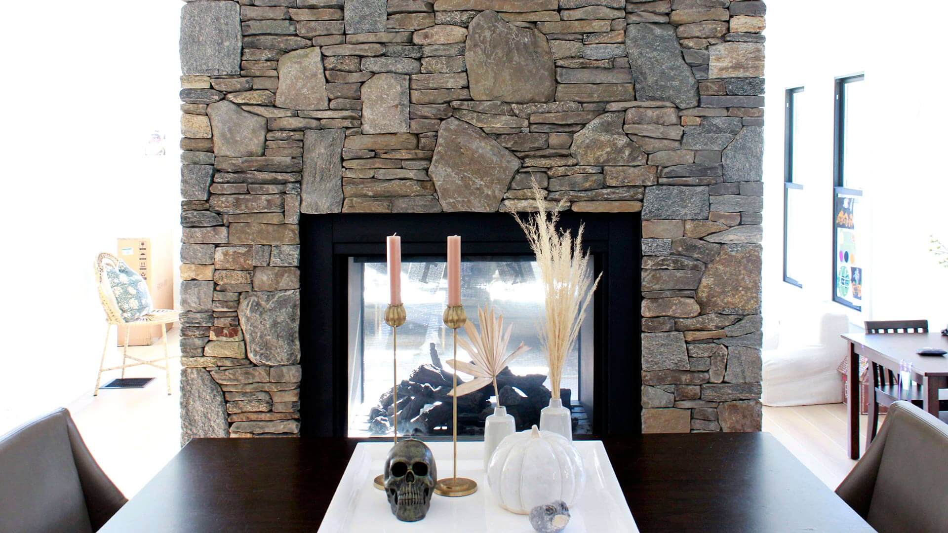 The interior boasts an open floor plan and modern amenities, all centered on a double story stone masonry gas fireplace.